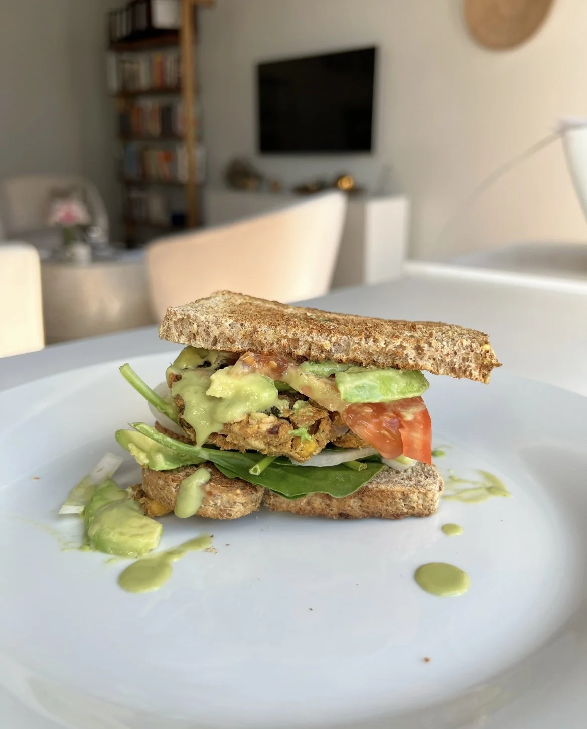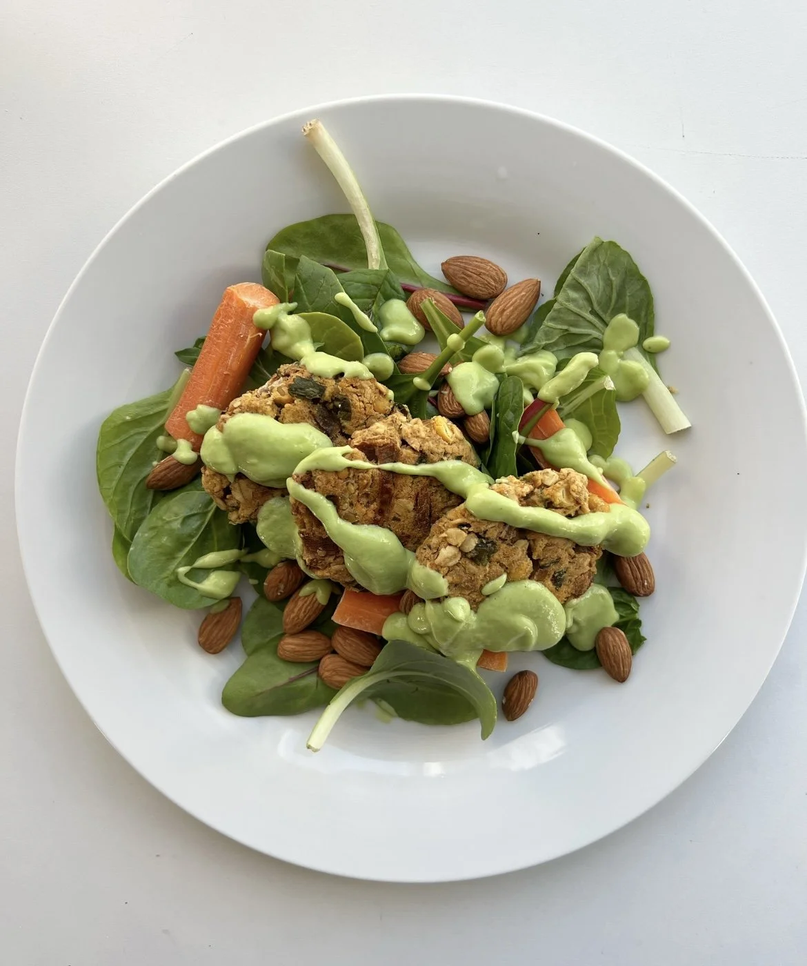 This burger recipe is SO easy, extremely tasty, and absolutely packed with fiber and fresh herbs. It can be put on top of a salad OR eaten like a classic burger. I wanted something a bit lighter to go on top of it, so I created a cool avocado cucumber dressing that pairs perfectly with the spices of the hummus burger. Brent and I ate on these burgers for half a week - they’re fun, light, easy (you can make it with your kids!) and the oven does most of the work so you have time to spend with loved ones while they cook.