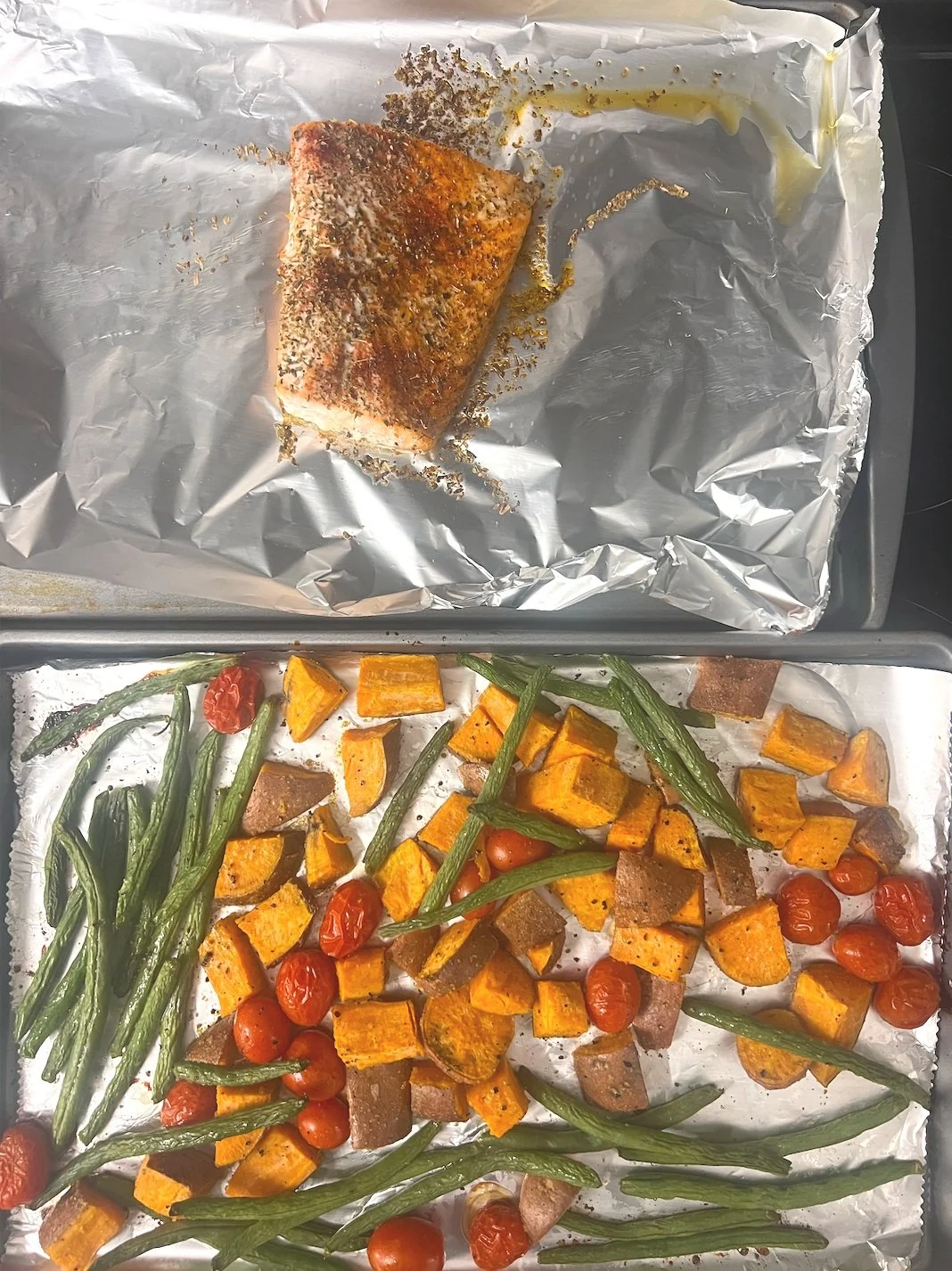 When the 15-minute timer is up, add the salmon into the oven, then cook for 20 more minutes.