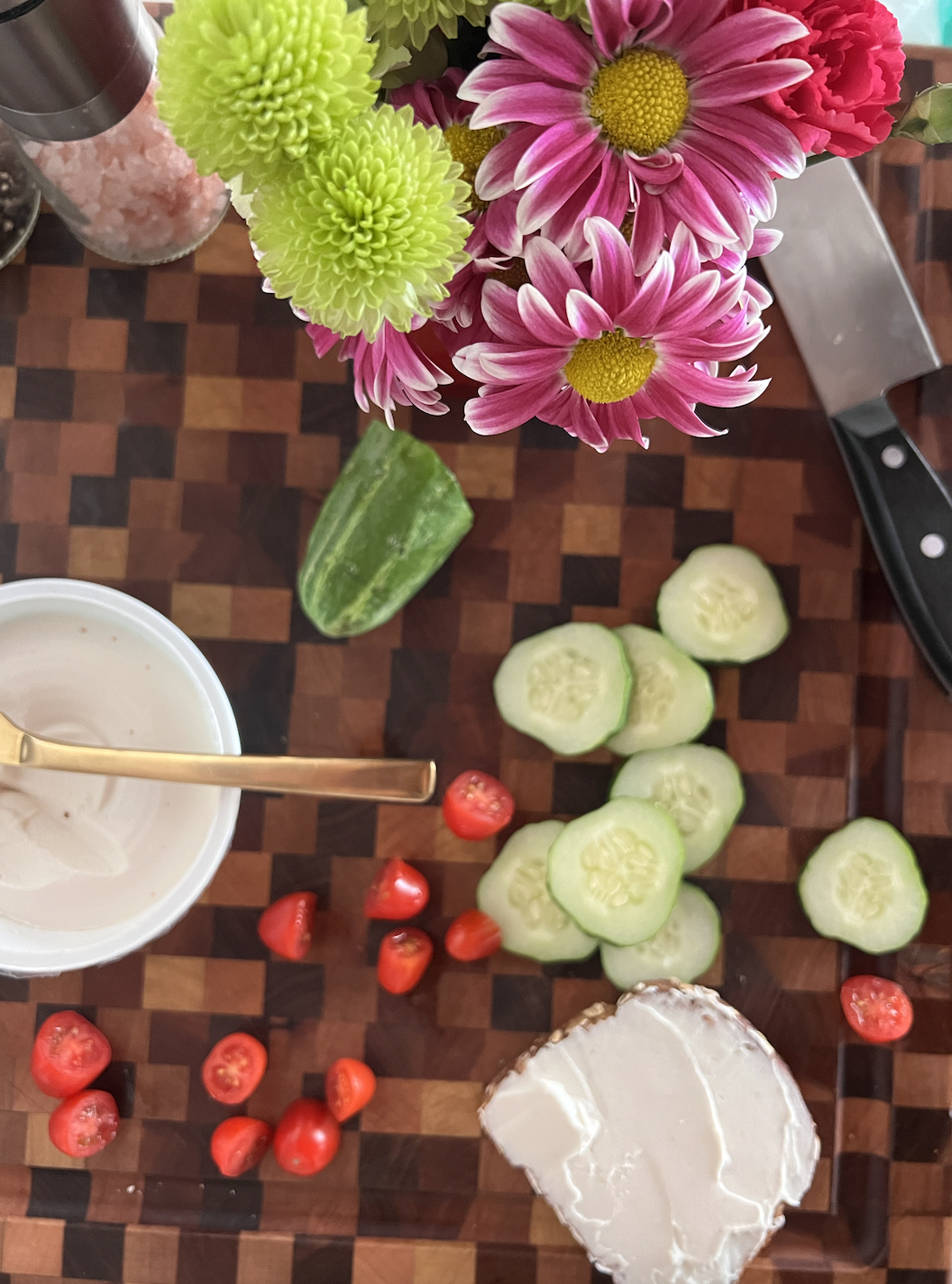 Dave’s Killer bread is my absolute favorite because they don’t use any added fillers or ingredients, it’s packed with real whole grains and a ton of fiber, and they’re USDA certified organic. It checks almost all of my wellness boxes. This toast is an easiest light lunch or dinner, simply toasting the bread in the toaster, cutting up some cucumbers and juicy, sweet cherry tomatoes, all in combination with the creaminess of the cream cheese (I used dairy free) and nuttiness of sesame seeds (who else used to love the sesame bread at Lazarri’s if you’re a Jonesboro local? 🤤). I finished it all off with smoked paprika and dried oregano to pack in the flavors.