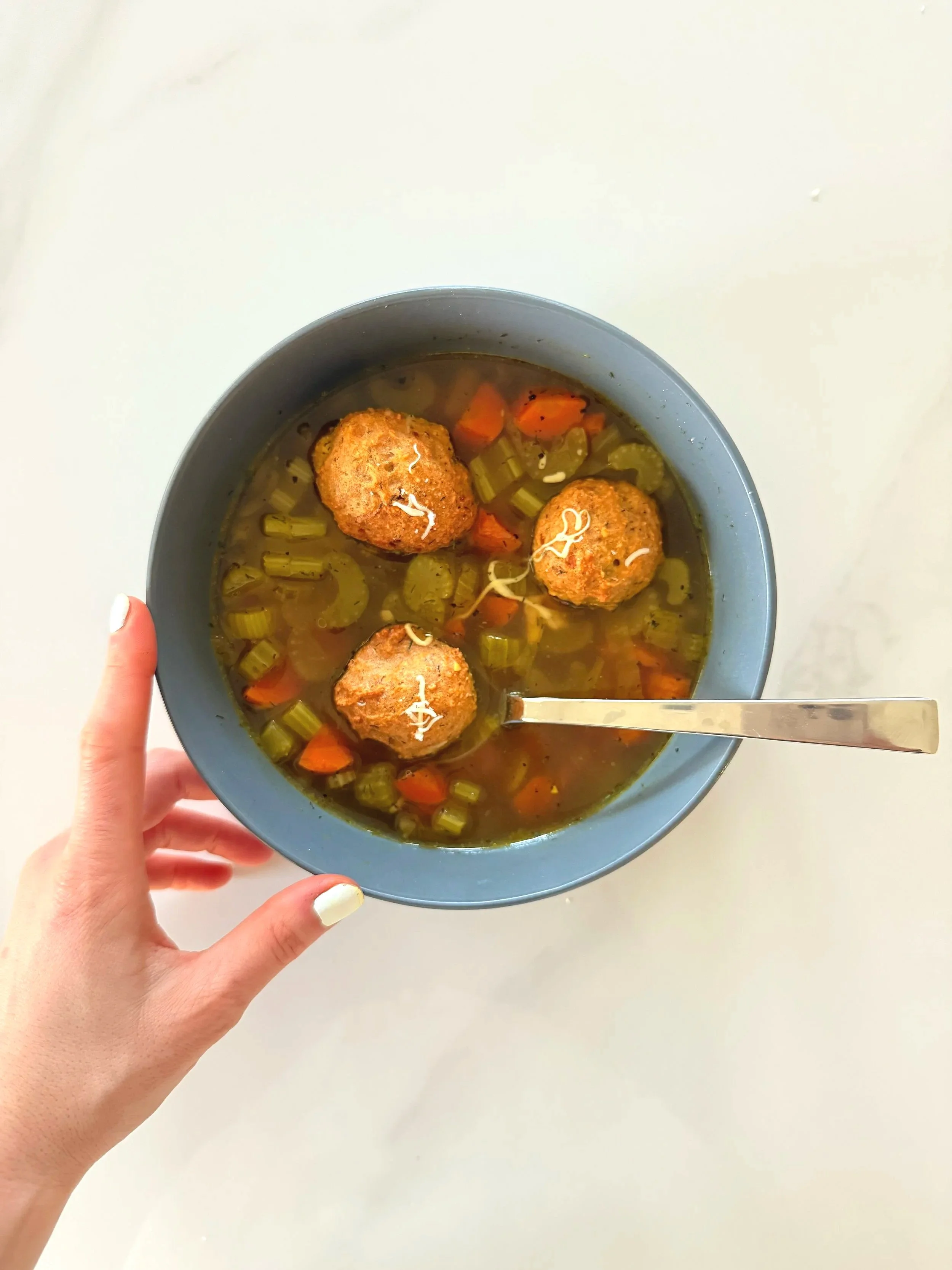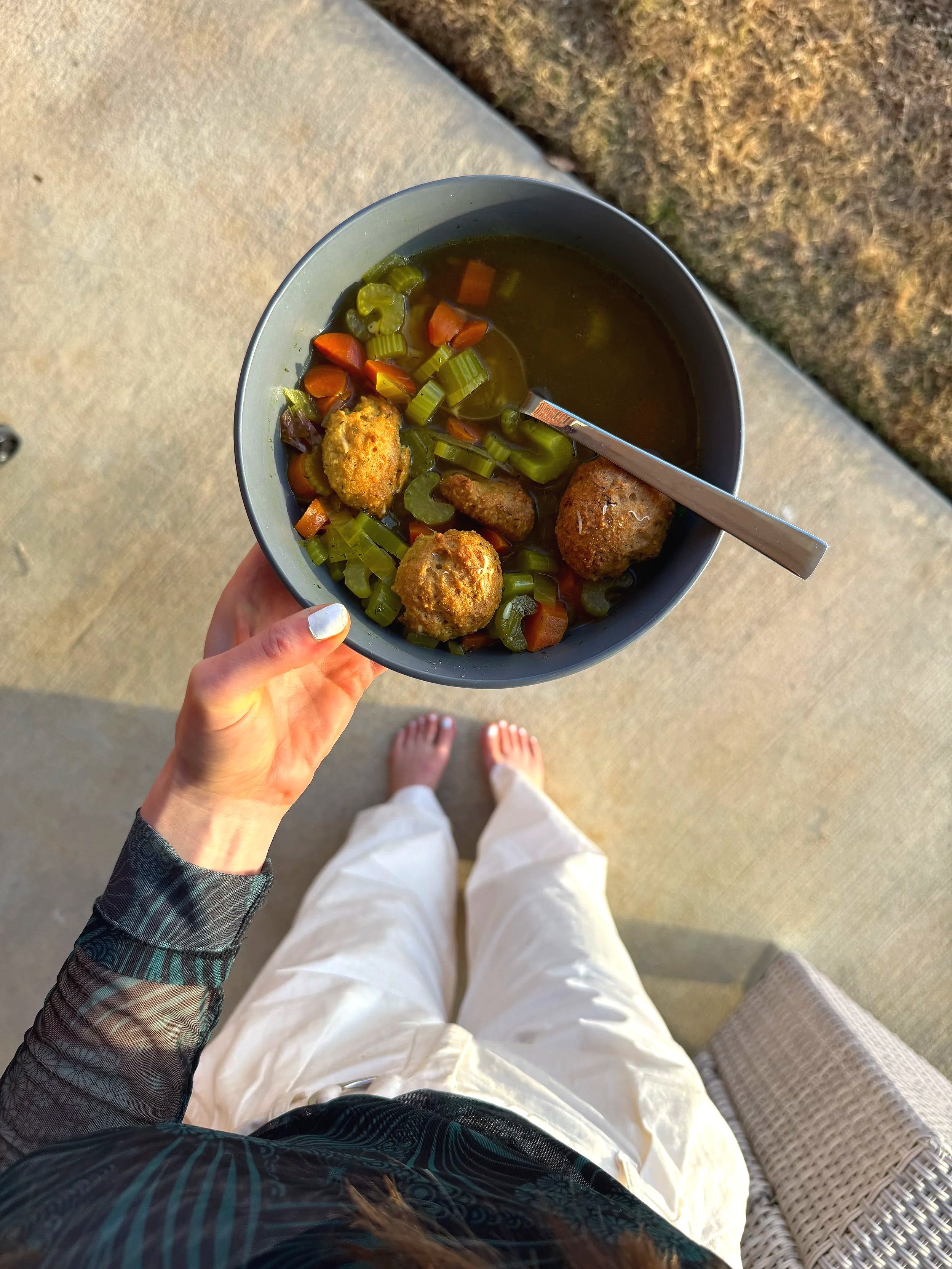 I was so interested to learn about the history of Matzo Ball Soup, a recipe that I have been wanting to make for a long time. In celebration of Sabbath (Friday-Saturday of honoring rest), Jewish cooks in Central/Eastern Europe such as Germany, Poland, Lithuania started making dumplings from matzo meal, eggs, fat (like chicken or marrow), and seasonings for their soups. I always liked the look of the soup because it reminded me of meatballs, but I didn’t want to eat meat! While you can easily add some clean chicken to this recipe and I did use chicken broth, this soup is an amazing detoxing soup that is free of meat. It’s a very minimal soup using celery, onion, and carrots as the base, but the matzo meal and spices of dill weed, bay leaves, and turmeric, it’s the perfect light and hearty soup to not only celebrate Sabbath, but also cleanse our mind, body, and soul during this time of rest. We made this for our little snow storm (so fun!) and it was absolutely delightful.