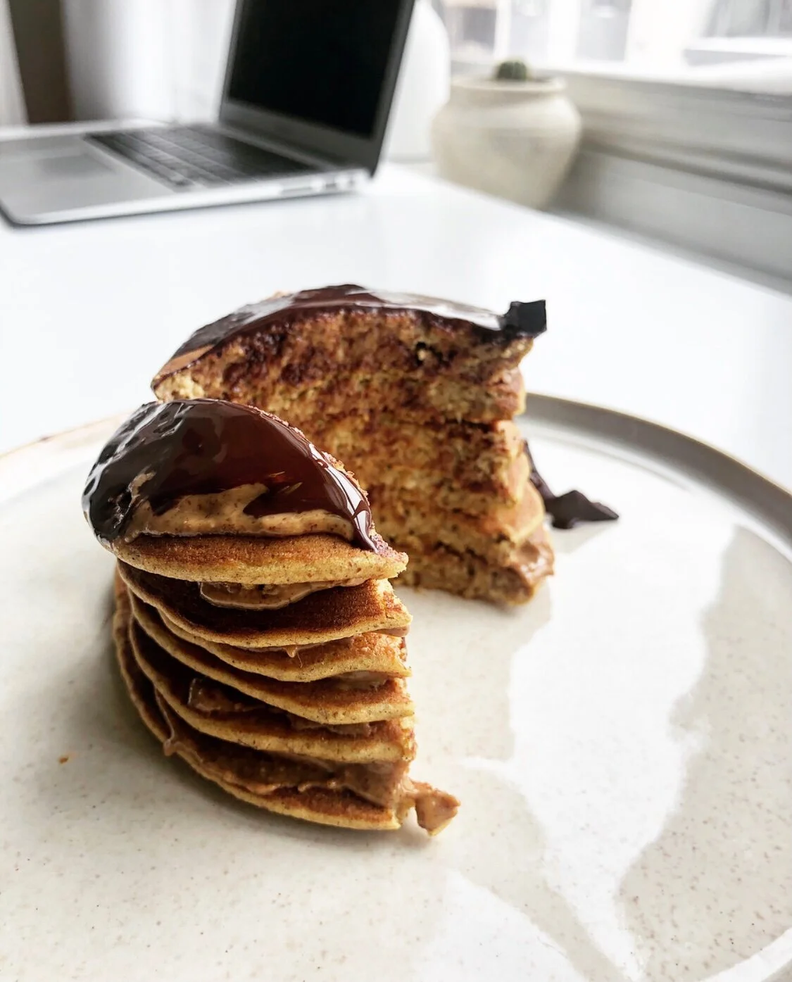 Stack pancakes (your desired height… get brave) with almond butter spread in between each pancake. Top with chocolate square while it’s HOT and drizzle with maple syrup.
